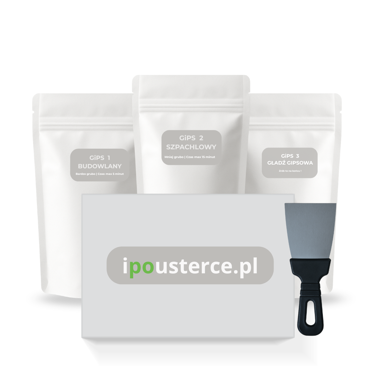 Zawiera wszystkie niezbędne materiały: gips budowlany, gips szpachlowy, gładź finiszową, grunt oraz papier ścierny.